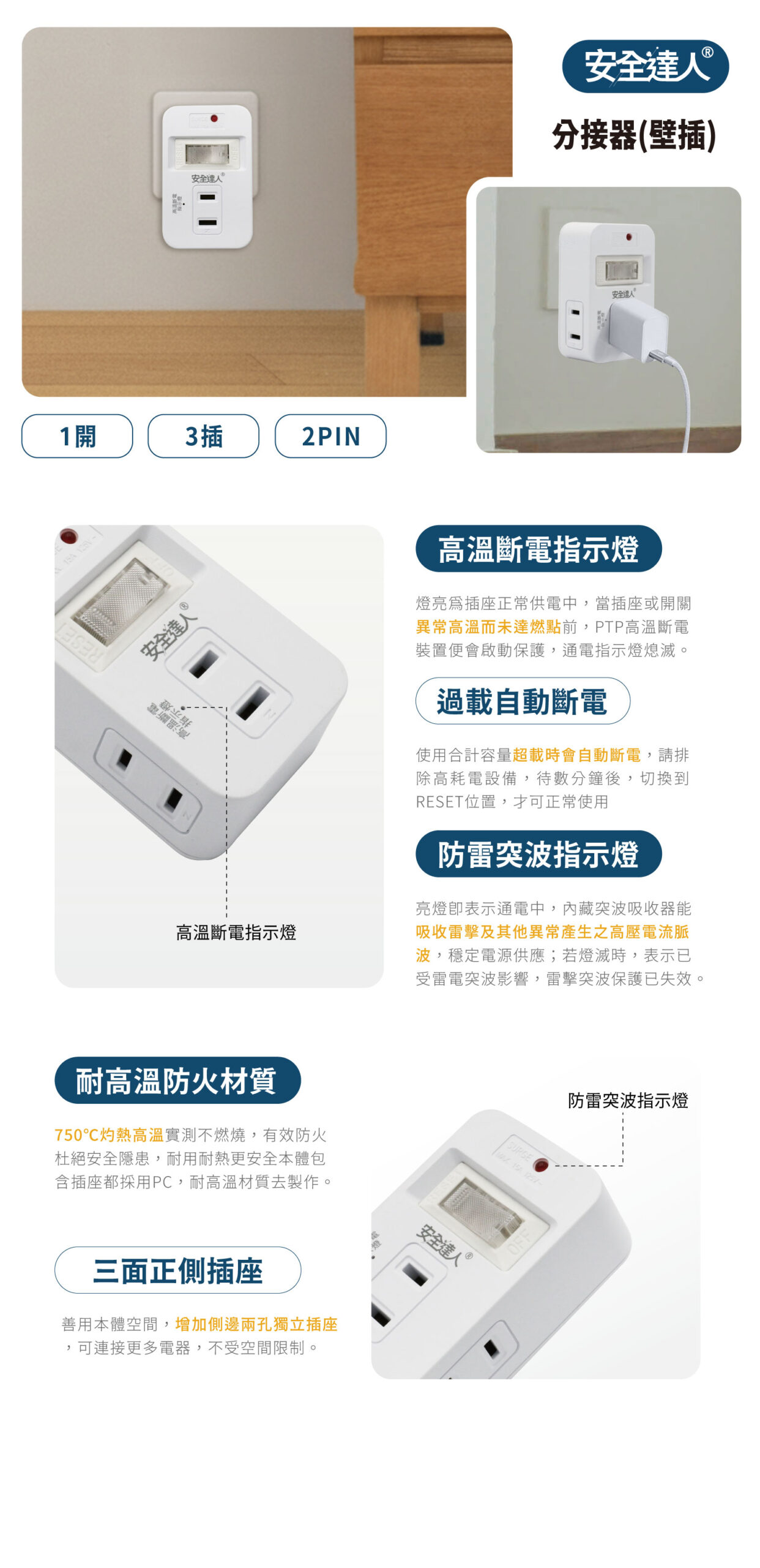 【安全達人R-06L】1開3插2P 分接器(壁插)