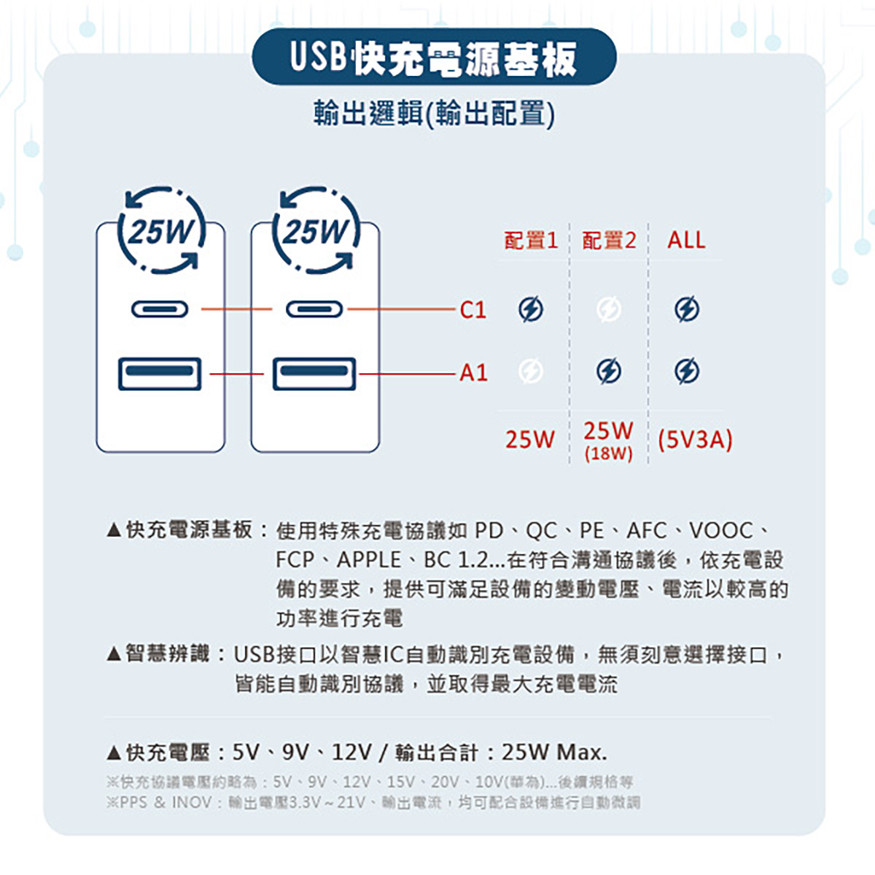 QC(25W)Type A1/A2 : 5V-3A 9V-2.77A 12V-2.08A