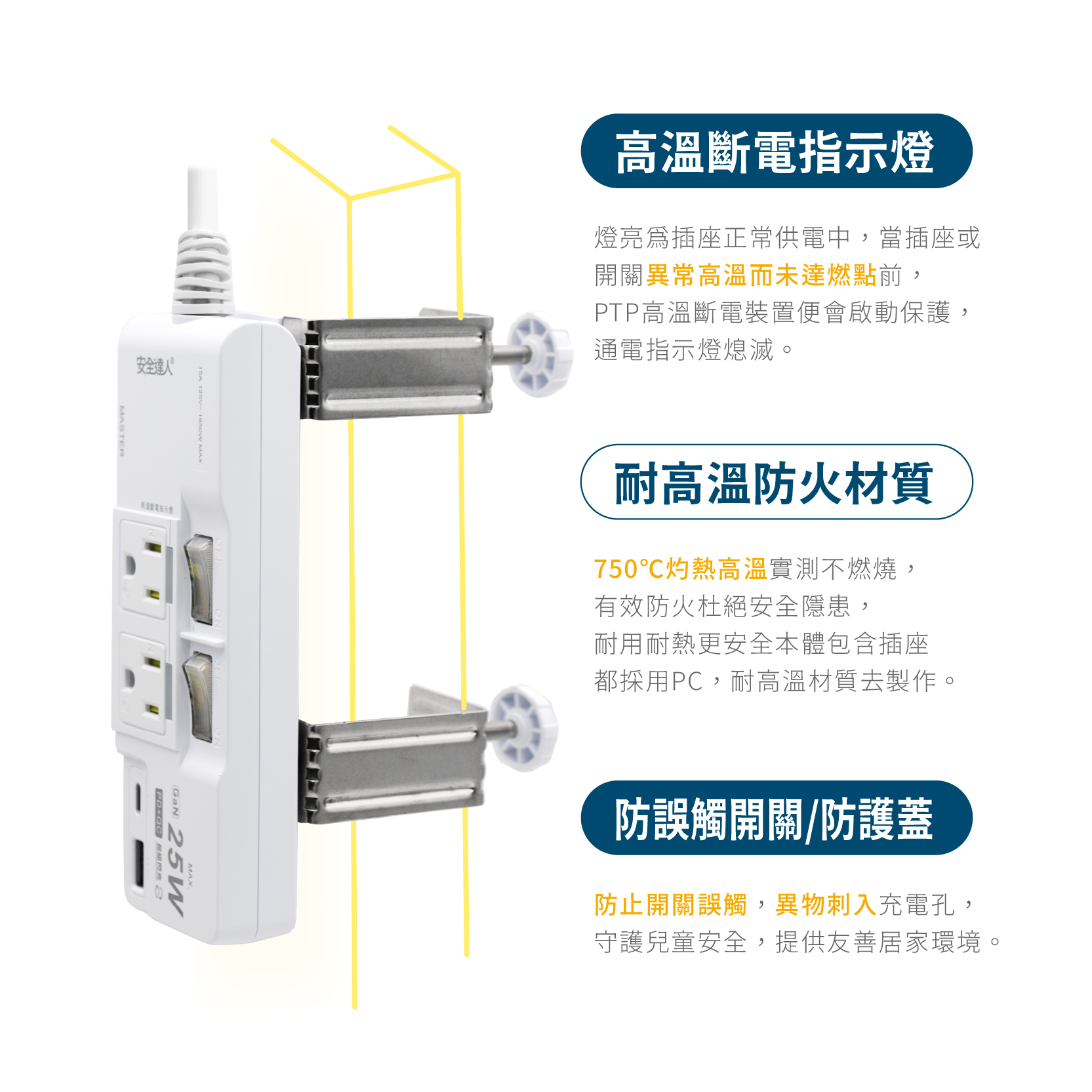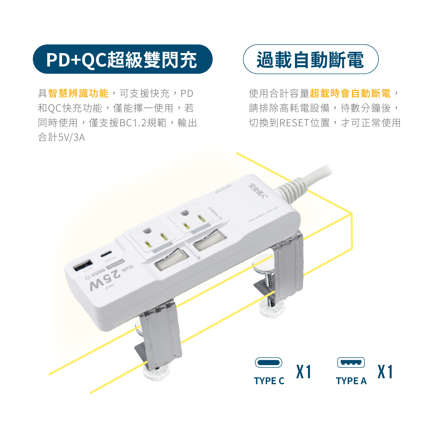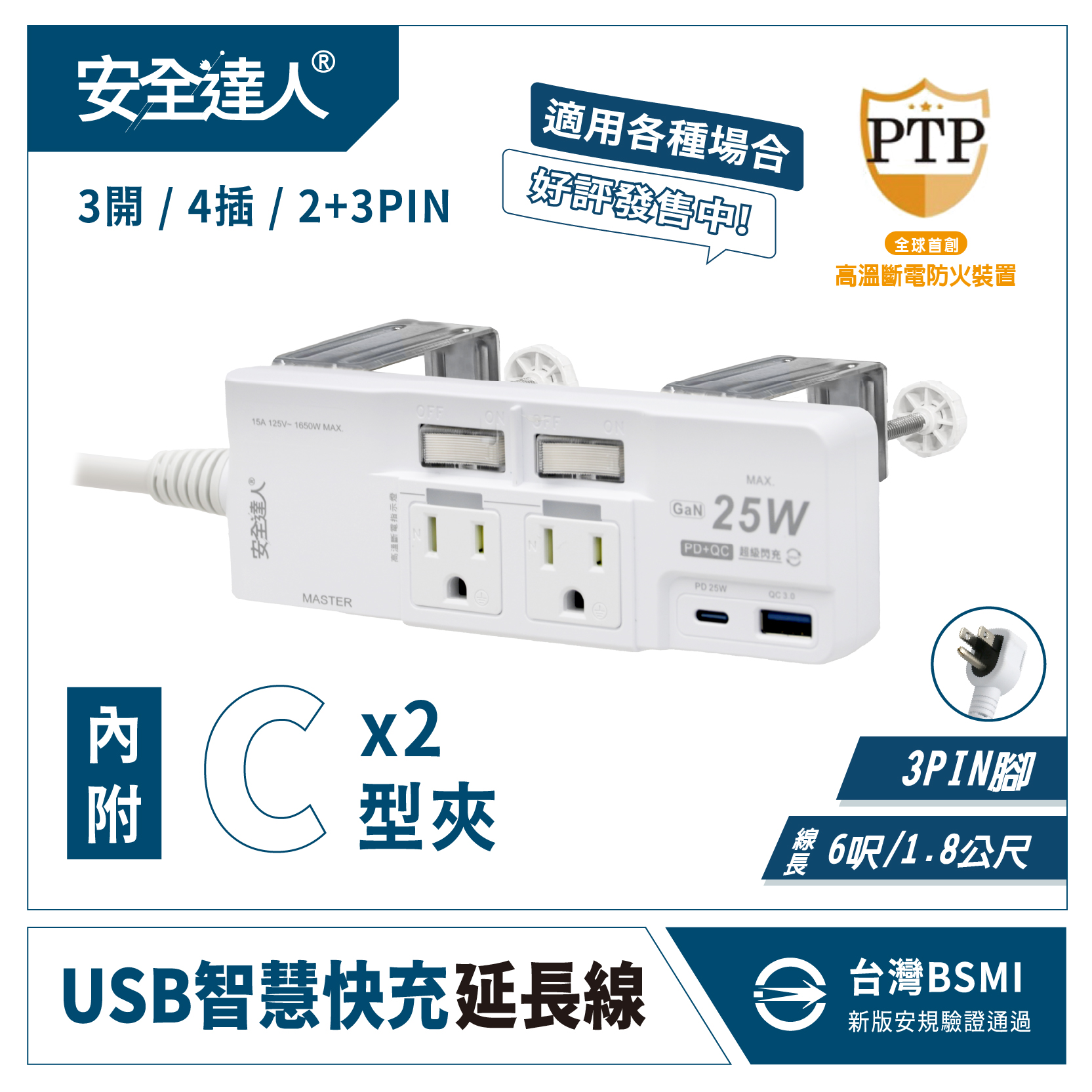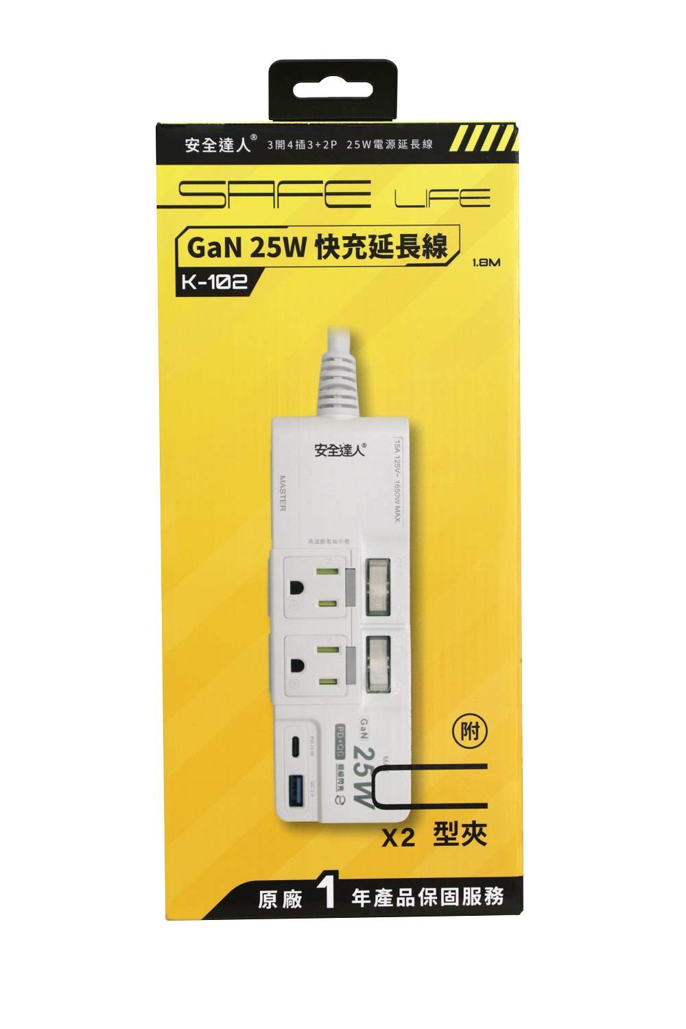 【Palladium K-102P25NC+C】3開4插2+3P PD25氮化鎵快充延長線 (含夾子配件)